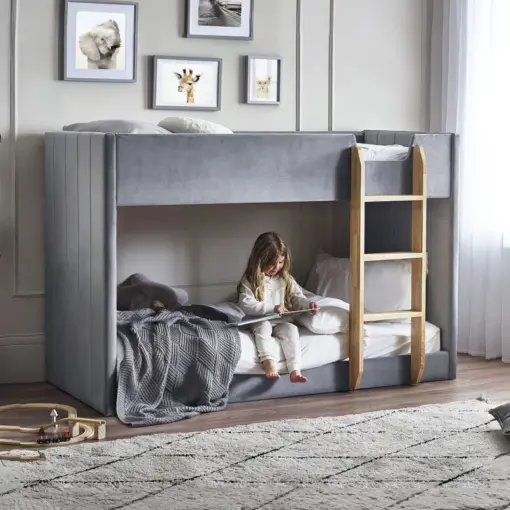 - Wrapped in grey velvet, this bunk exudes a soft and inviting charm.
