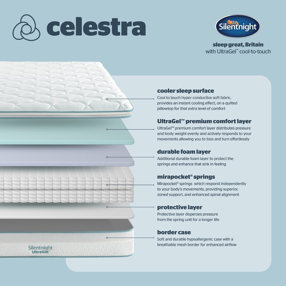 Enhance your comfort all year-round with our smart UltraGel™ cool-to-touch layer that’ll leave you feeling fresh. 5X more breathable than memory foam, the cooling technology is integrated into the surface fabric alongside 3000 Mirapocket® springs that provide superior pressure relief and body moulding.