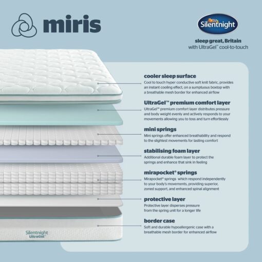 Enhance your comfort all year-round with our smart UltraGel™ cool-to-touch layer that’ll leave you feeling fresh. 5X more breathable than memory foam, the cooling technology is integrated into the surface fabric alongside 3000 Mirapocket® springs that provide superior pressure relief and body moulding.